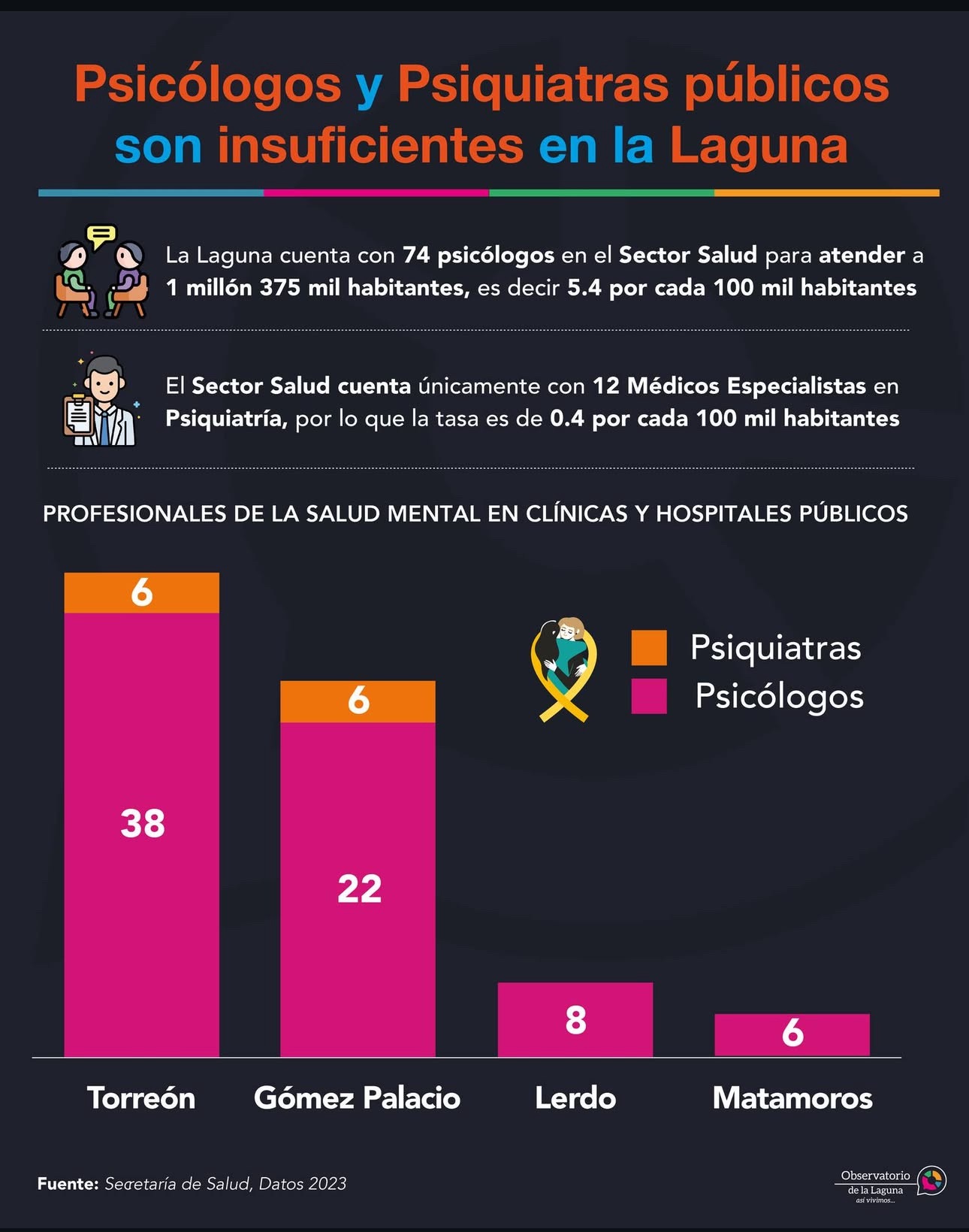 Los datos, analizados por el Observatorio de La Laguna, provienen de la Secretaría de Salud 2023 y muestran una situación crítica. En el sector público, la región cuenta con una tasa de 5.4 psicólogos por cada 100 mil habitantes, y una alarmante tasa de 0.4 psiquiatras por cada 100 mil habitantes.