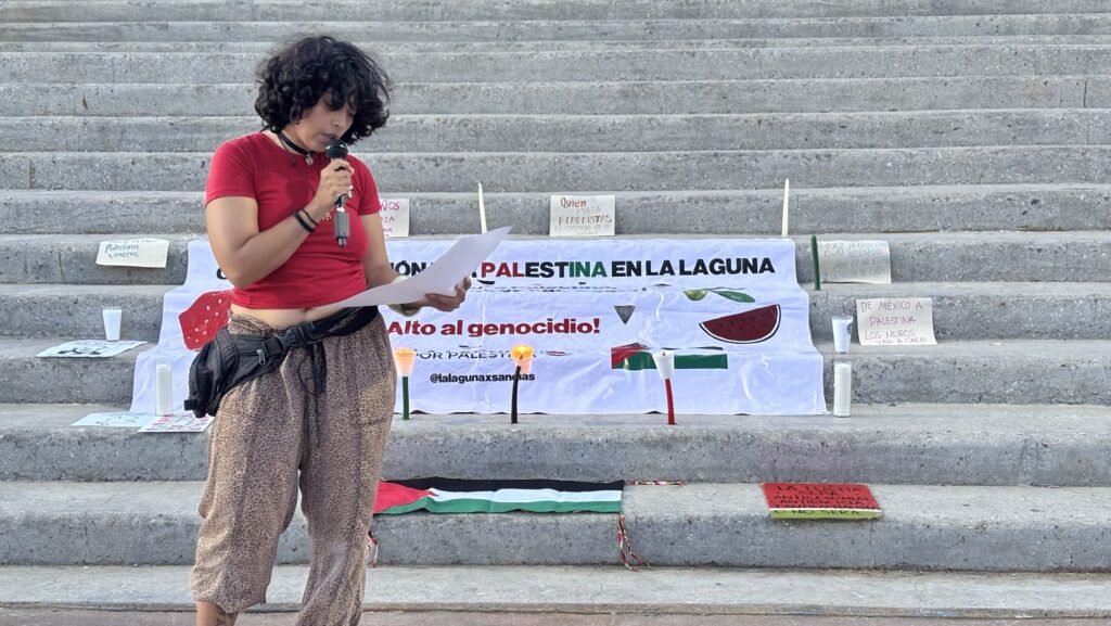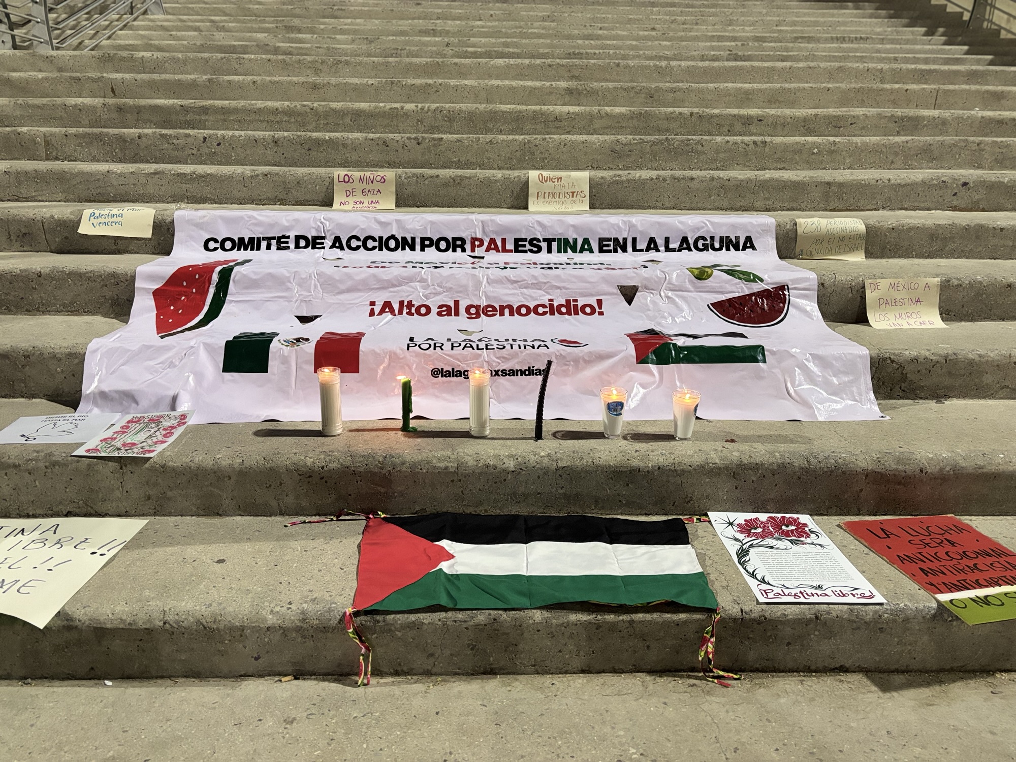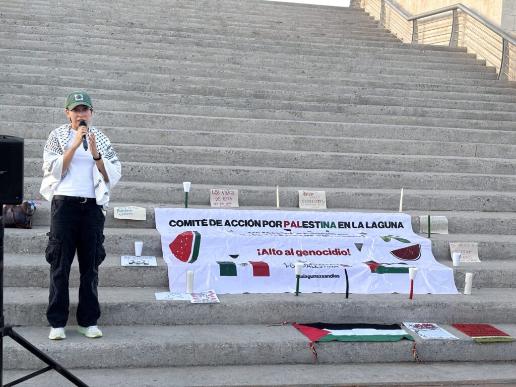 Ni en México ni en Palestina se matará la verdad, matando periodistas, por ello en un acto de protesta y solidaridad, el Comité de Acción por Palestina en la Laguna llevó a cabo una vigilia este domingo 17 de agosto en las escalinatas de la Plaza Mayor de Torreón. El evento se realizó en memoria de los más de 238 periodistas palestinos que han sido asesinados por las acciones militares de Israel desde el inicio del conflicto.