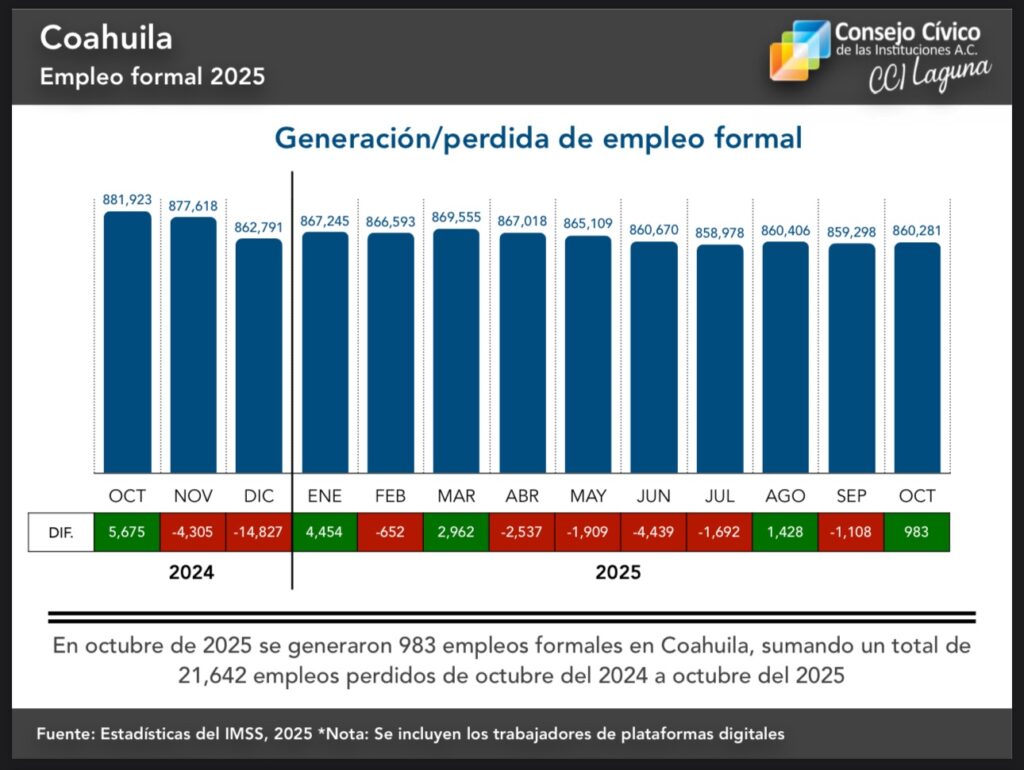 Las estadísticas oficiales de empleo formal emitidas por el IMSS y analizadas por el Consejo Cívico de La Laguna (CCI Laguna), reflejan un panorama laboral que se aleja drásticamente de la meta de los 66 mil puestos.
