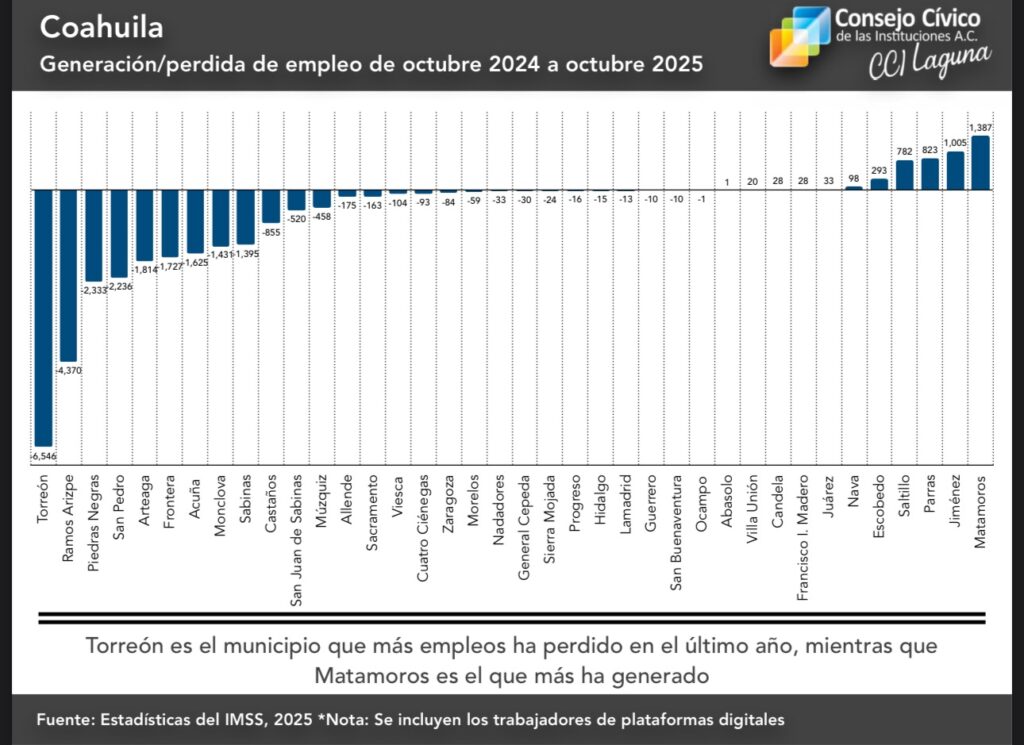 La destrucción de empleo se concentró de manera crítica en diversas regiones del Estado. Los municipios que registraron las mayores pérdidas netas de empleo entre octubre de 2024 y octubre de 2025 fueron: Torreón, con -6,546 empleos perdidos; Ramos Arizpe, con -4,370; Piedras Negras, con -2,333; San Pedro, con -2,236; y Arteaga, con -1,814.