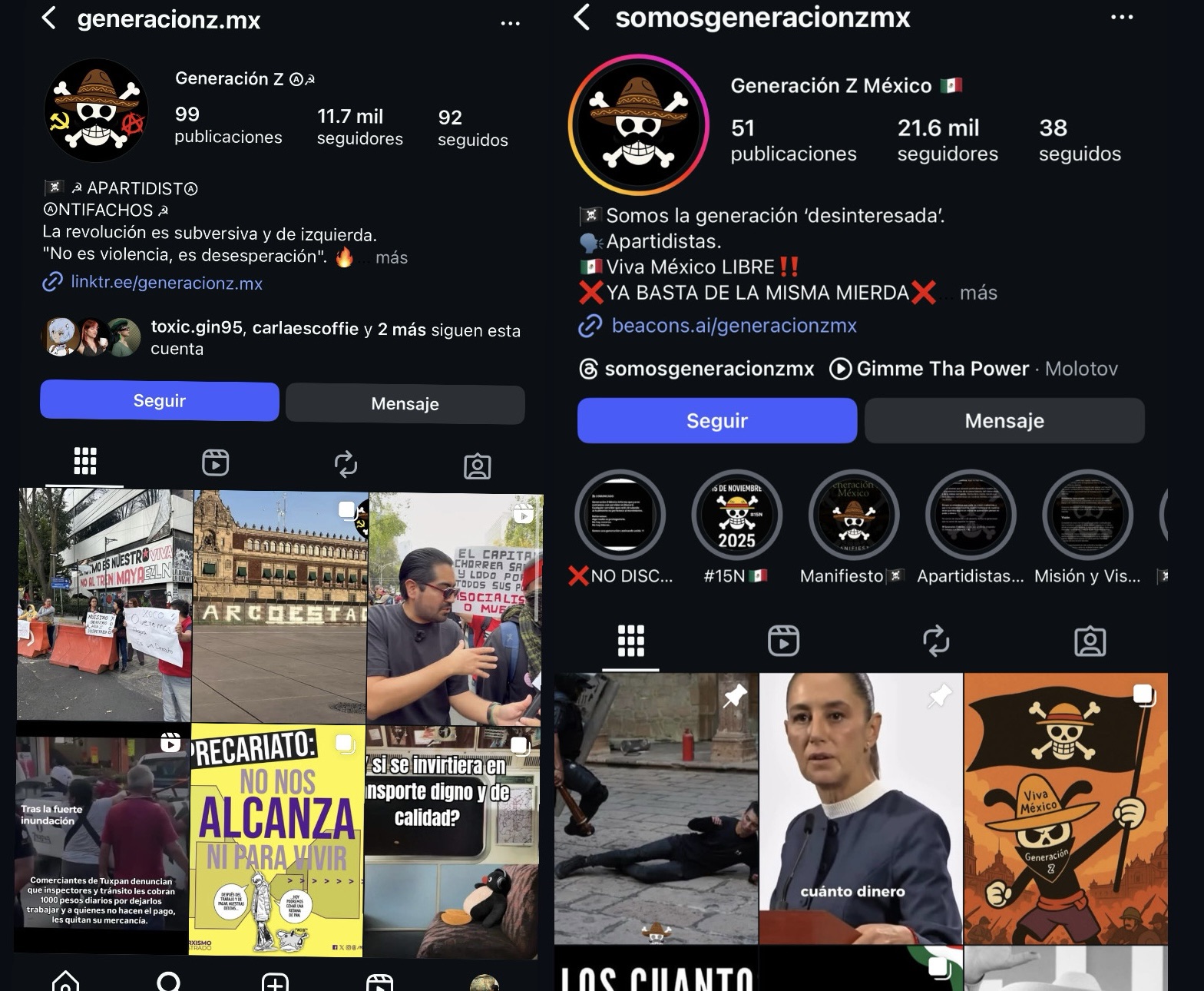 Por un lado, el perfil @somosgeneracionz (con 21.6 mil seguidores y creado en Octubre de 2025) es uno de los principales convocantes del 15N. Este perfil publicó el pliego petitorio que ha sido señalado por activistas como opositor, se caracteriza por criticar únicamente a la presidenta Claudia Sheinbaum y por compartir contenido en conjunto con influencers conocidos por sus ideas ultraderechistas.