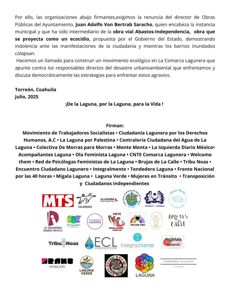 Las organizaciones firmantes, que incluyen al Movimiento de Trabajadores Socialistas, Ciudadanía Lagunera por los Derechos Humanos A.C., La Laguna por Palestina, y Contraloría Ciudadana del Agua de La Laguna, entre otras, denuncian que la negligencia en el mantenimiento del sistema de drenaje municipal y la implementación de la obra vial Abastos-Independencia, calificada como un “ecocidio”, han exacerbado los daños causados por las inundaciones en numerosas colonias.
