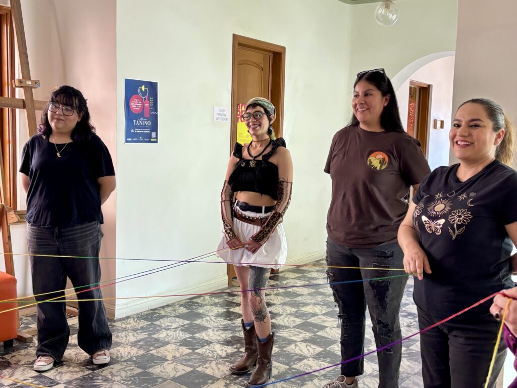 La tallerista inició formalmente la tarde con una dinámica titulada “El hilo de la memoria”, para “romper el hielo” y crear confianza. En ella, las participantes formaron un círculo mientras compartían su nombre, edad y una palabra que las describiera. Al terminar su intervención, cada mujer sujetaba una punta de un ovillo de lana antes de lanzarlo a otra compañera. Al final, un estambre de colores cruzó el pasillo del recinto a manera de red física, simbolizando que sus historias, profesiones y vivencias están profundamente conectadas entre sí.