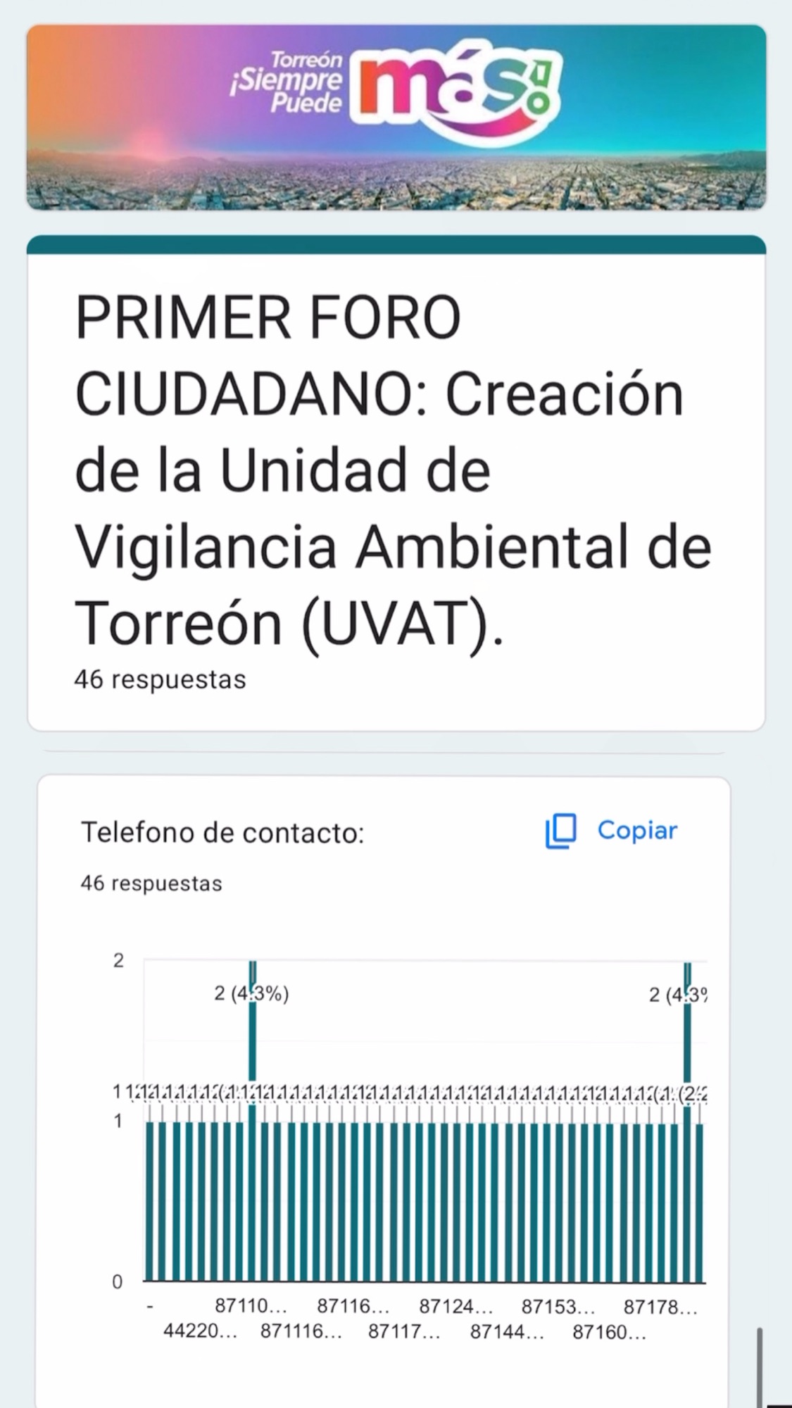 El Ayuntamiento de Torreón mantuvo expuestos durante 16 días los datos personales de ciudadanos que participaron en la consulta digital sobre la creación de la Unidad de Vigilancia Ambiental. Desde el cierre de la votación el pasado 20 de enero hasta este 5 de febrero, nombres, teléfonos y correos electrónicos de los 46 participantes fueron públicos debido a una configuración negligente en la plataforma Google Forms.