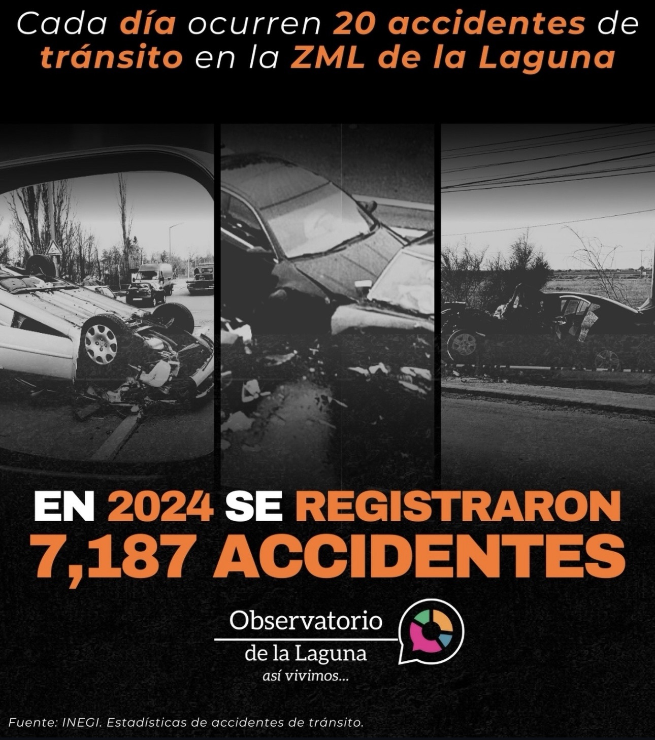 Estos datos, analizados por el Observatorio de la Laguna, revelan una realidad cotidiana de 20 accidentes al día, en promedio diariamente 20 veces alguien en la Laguna vive un choque, un susto, un volante torcido y, en palabras del propio organismo, “una historia que cambia el día”.