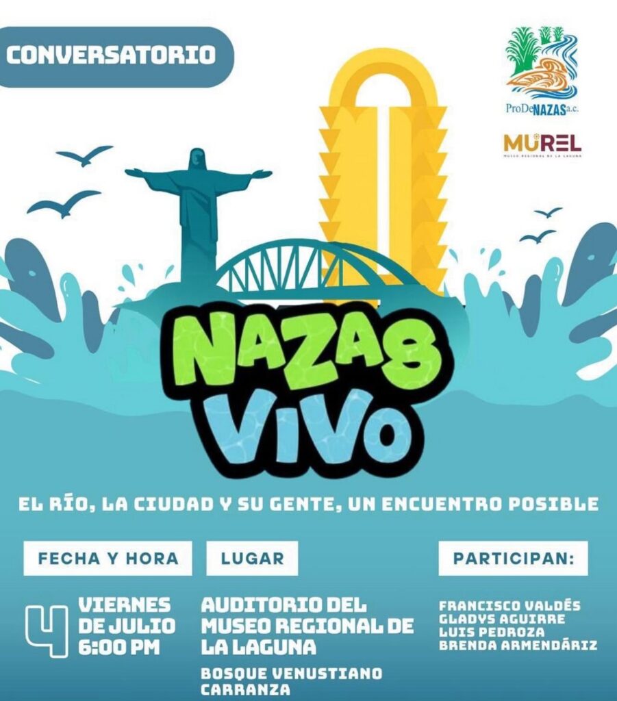 La Asociación Civil Pro Defensa del Nazas, en colaboración con el Museo Regional de La Laguna (MUREL), invita a la ciudadanía al conversatorio “Nazas Vivo: El río, la ciudad y su gente, un encuentro posible”.